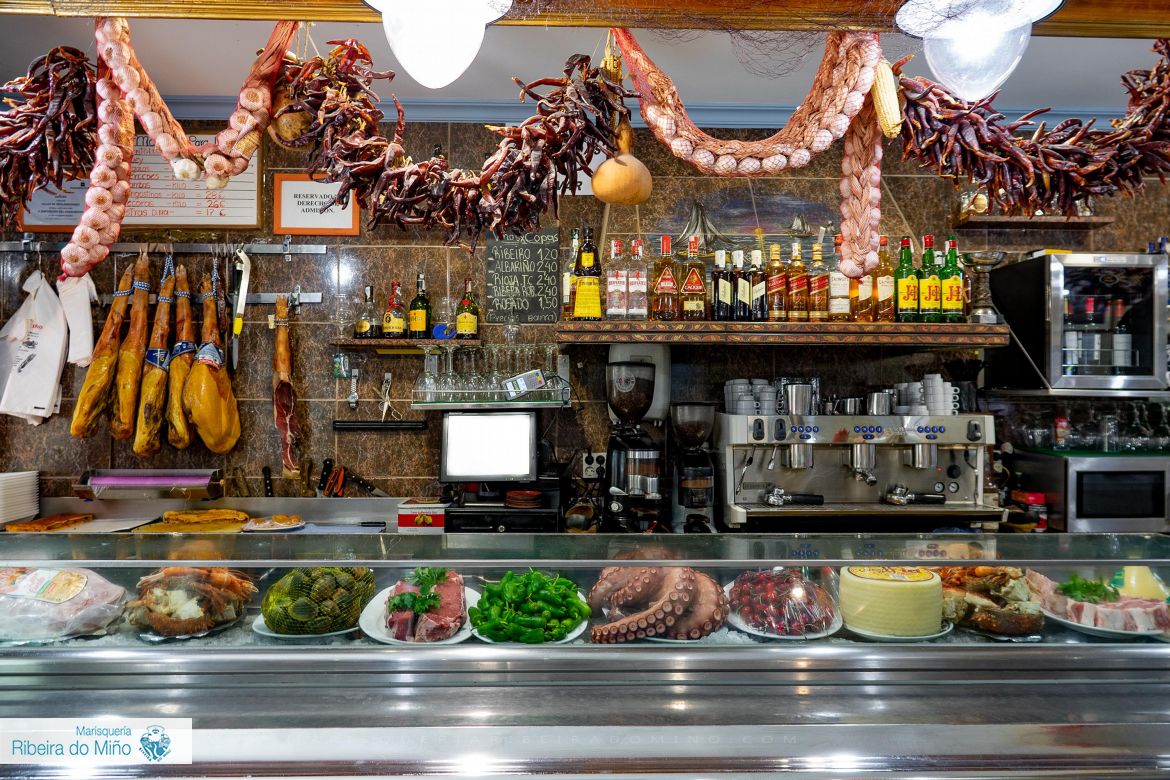 Barra de bar en Galicia con vitrinas de marisco, pulpo, quesos y embutidos, jamones colgados, ristras de ajos y pimientos secos, botellas de licor y cafetera industrial en un ambiente tradicional.