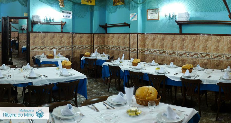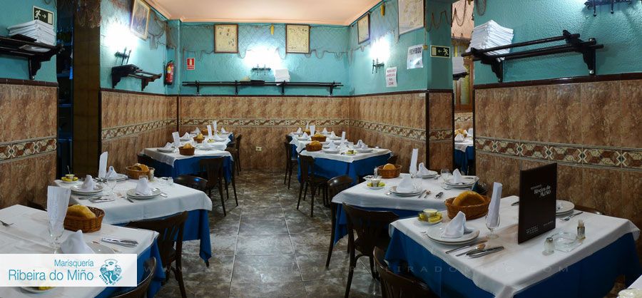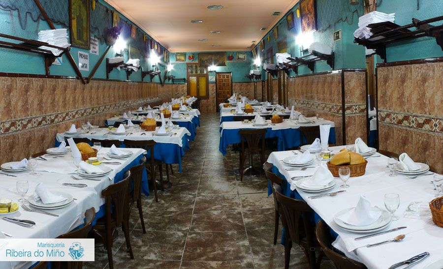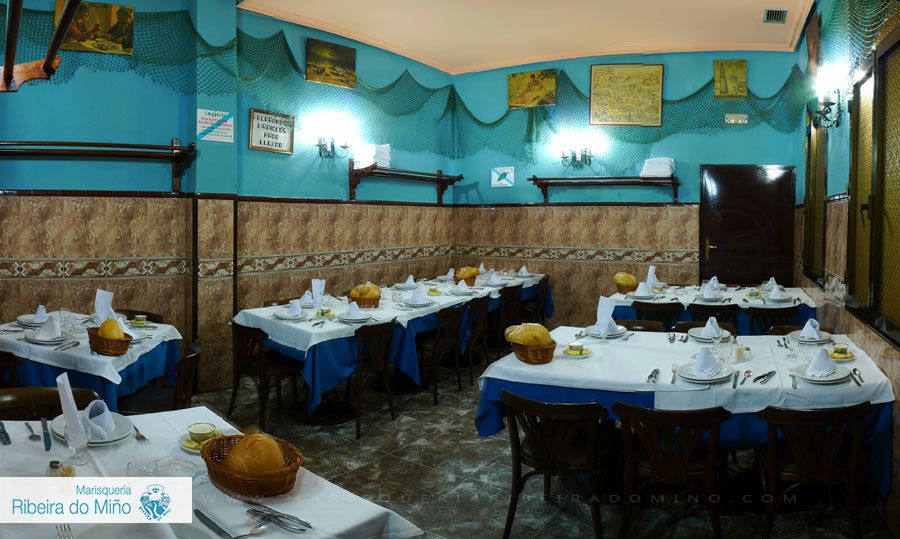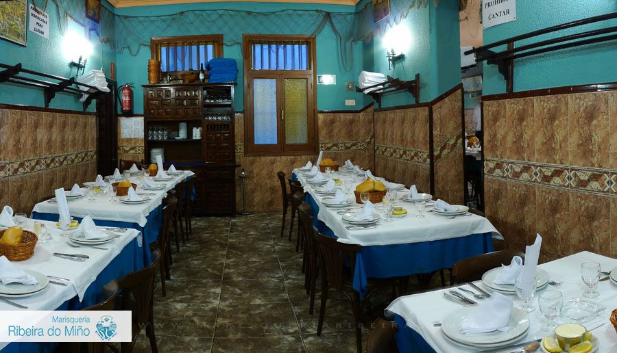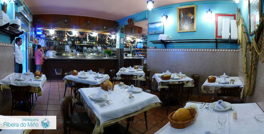 Barra de la marisquería gallega con pulpo, marisco, jamón y licores tradicionales
